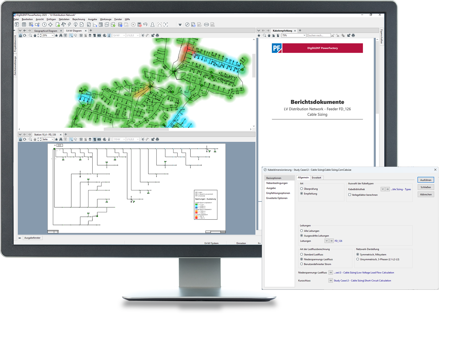 - Verschiedene Ergebnisberichte und automatisches Modifizieren der Kabeltypen im existierenden Netz oder durch Erzeugen einer neuen Variante