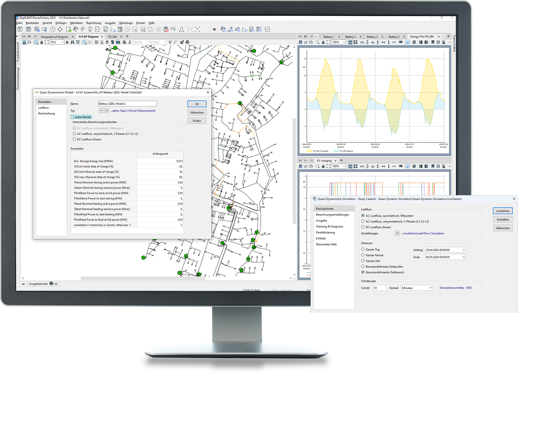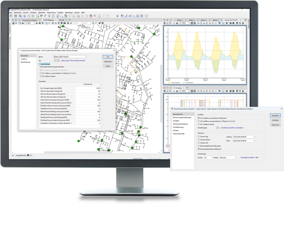 Die quasi-dynamische Simulation ist eine Reihe von Lastflussberechnungen, die in bestimmten Zeitintervallen durchgeführt werden, um den Netzzustand über einen bestimmten Zeitraum zu bewerten.