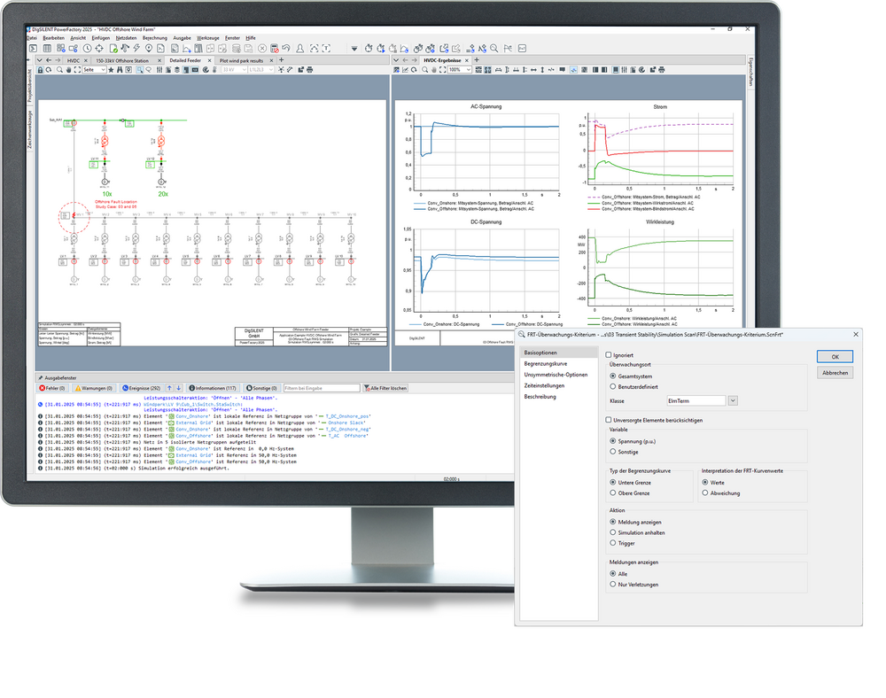 Das Tool 'RMS-Simulation' in PowerFactory, das eine Simulationsüberwachungsfunktion beinhaltet, kann zur Analyse von Mittelzeit- und Langzeit-Vorgängen sowohl im symmetrischen als auch im unsymmetrischen Zustand verwendet werden. Eine umfangreiche Bibliothek von Standardmodellen (z. B. IEEE) ist enthalten, und grafische Umgebungen erleichtern die Erstellung von benutzerdefinierten Modellen mit DSL (DIgSILENT Simulation Language) oder Modelica. Schnittstellen ermöglichen den Import und Export von Modellen, und flexible Co-Simulationsoptionen sind ebenfalls verfügbar.
