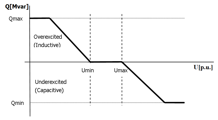 The Q(V) characteristic is available as option for the reactive power control for load flow calculation in the generator models and in the station controller model. The slope of the characteristic is entered via droop input.