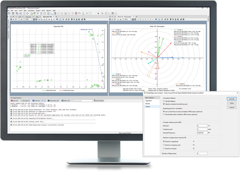 PowerFactory’s Small Signal Stability module provides an eigenvalue analysis tool that is suitable for both balanced and unbalanced network representations. The calculation can be configured to consider all modes of oscillation in the system, or to perform a selective analysis (especially useful in large networks). It considers not only conventional generation, but also non-conventional generation such as wind turbines, PV systems and HVDC systems. The results can be visualised in eigenvalue plots or tabular reports, including all relevant information such as frequency of oscillation, damping and damping ratio. The participation factors of the state variables, observability (right eigenvectors) and controllability (left eigenvectors) can be visualised in bar and polar plots.
