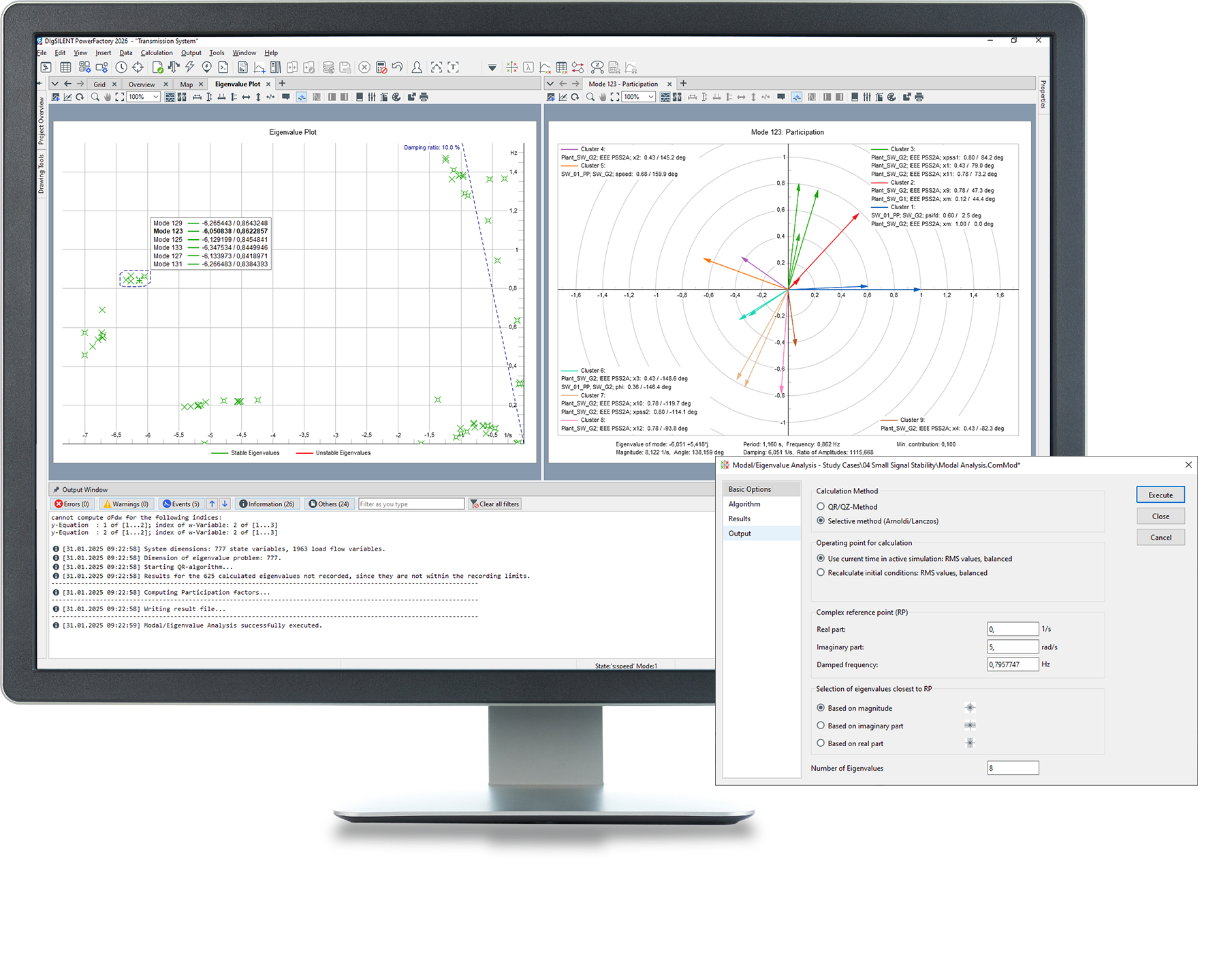 - Detailed reports of oscillatory modes including participation factors of state variables, controllability